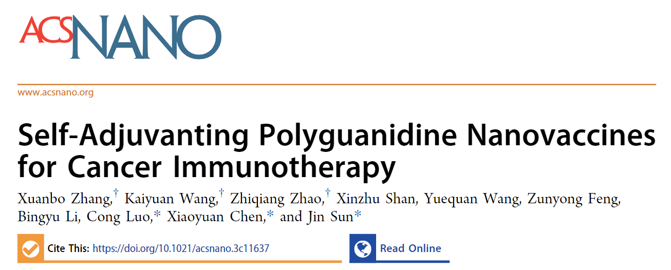 2024年2月26日,pa电子官方网站孙进/罗聪团队在美国化学会旗下期刊《ACS Nano》(IF=17.3)发表题为“Self-Adjuvanting Polyguanidine Nanovaccines for Cancer Immunotherapy”。pa电子pa电子官方网站孙进教授和罗聪教授,新加坡国立大学陈小元教授为本文通讯作者,博士毕业生张轩博,王开元及2023级博士生赵志强为本文共同第一作者,pa电子官方网站为第一通讯单位。