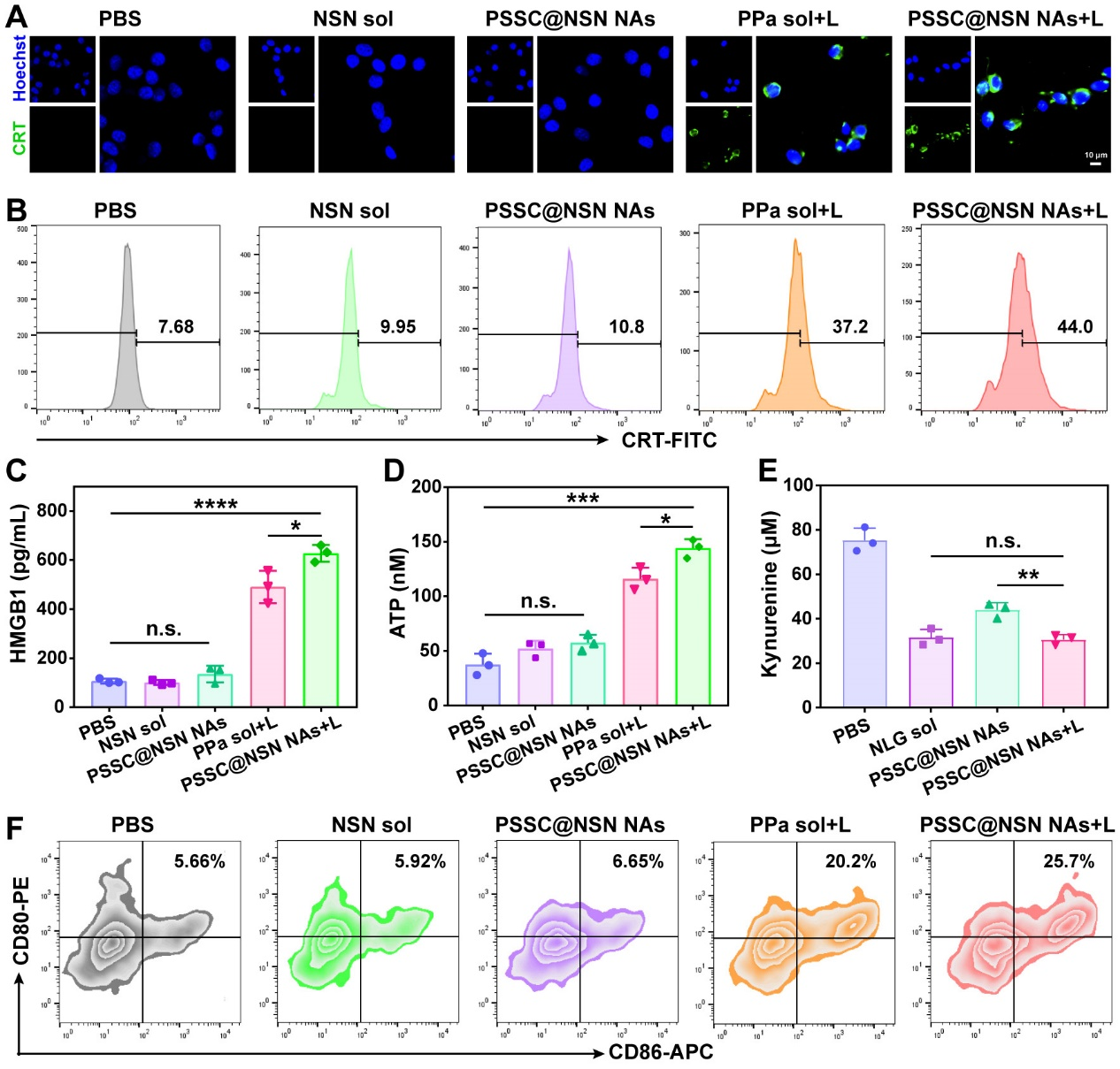 接下来,作者考察了超分子纳米组装体的时空可控的级联药物激活,结果如图3所示。在还原环境中二硫键断裂促进超分子纳米组装体解体有效缓解了PPa的ACQ效应,产生1O2能力显著增强,而H2O2的加入和近红外照射均能够使NSN中的单硫键断裂,实现NLG919的释放,并且呈现时间依赖性。进一步地,同时加入H2O2和进行近红外光照射能够进一步加速NLG919的释放,并且在与DTT共孵育后缓解ACQ效应后再联合H2O2和近红外光照射后显示出更高的释放速率,实现了时空级联药物激活。