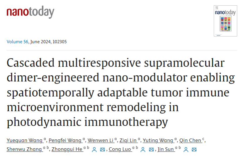 2024年5月6日,pa电子官方网站何仲贵/孙进/罗聪团队在爱思唯尔旗下期刊《Nano Today》(IF=17.4)发表题为“Cascaded multiresponsive supramolecular dimer-engineered nano-modulator enabling spatiotemporally adaptable tumor immune microenvironment remodeling in photodynamic immunotherapy”研究型论文,pa电子pa电子官方网站孙进教授、罗聪教授和何仲贵教授为本文通讯作者,2021级博士生王悦全为本文第一作者,pa电子官方网站为第一通讯单位。