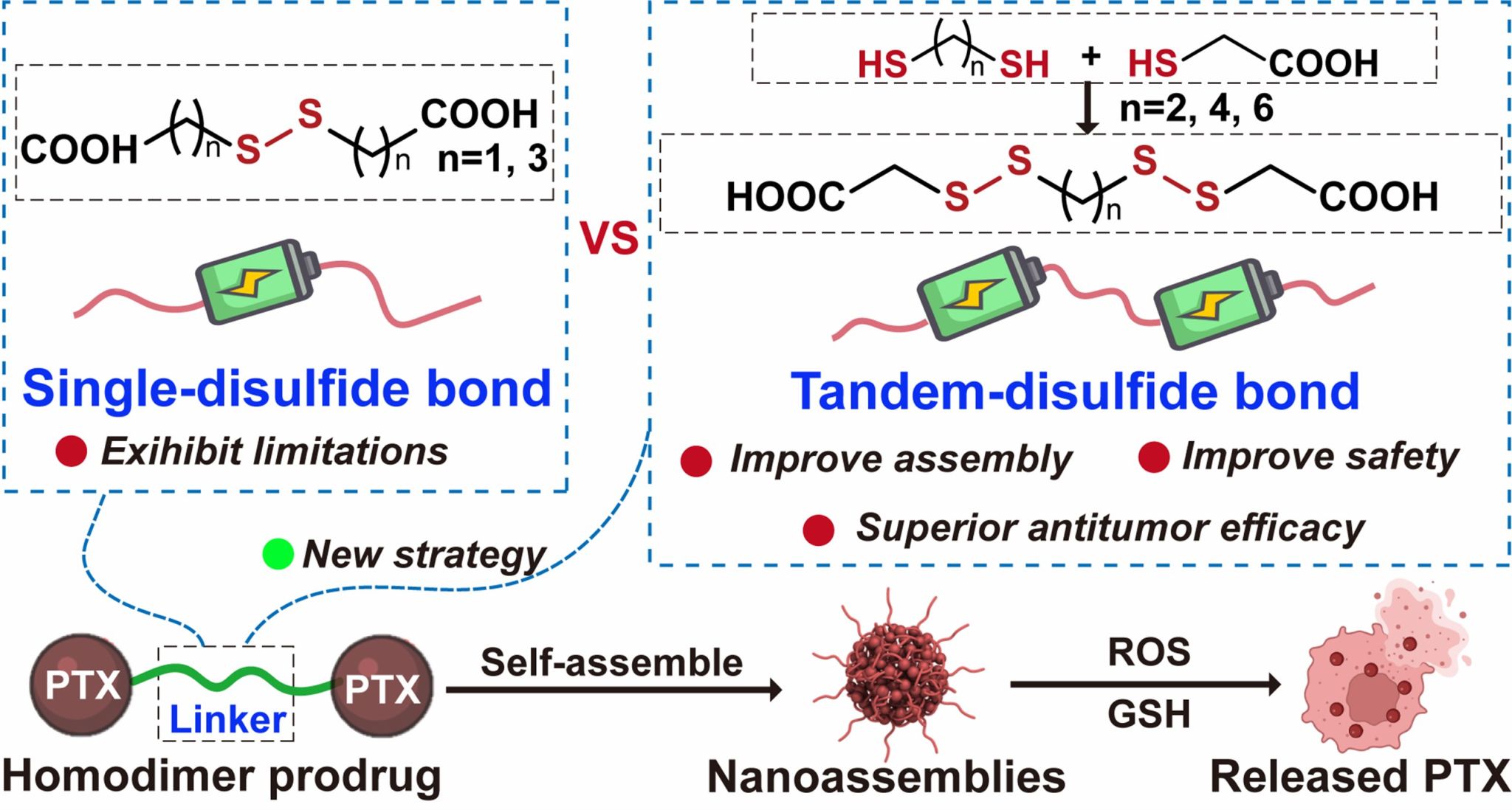 近日,pa电子药剂学科孙进科研团队在化学领域国际权威期刊J. Am. Chem. Soc.(IF:14.4)发表了碳原子间隔的“串联型”双二硫键桥连同二聚体前药纳米组装体的最新研究进展,题目为:”Carbon-spaced tandem-disulfide bond bridge design addresses limitations of homodimer prodrug nanoassemblies: Enhancing both stability and activatability”。