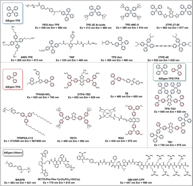 PEG-Azo-TPE、TPE-Azo、AWS-TPE、TPAQS-NO2、TNP、TPE-2E N-oxide、TPE-4NE-O和QM-HSP-CPP是肿瘤微环境响应的荧光成像AIE纳米探针;MASPB和TPNPDA-C12是细胞器靶向的荧光成像AIE纳米探针;2TPE-4E和2TPE-2T-BI是生物正交的荧光成像AIE纳米探针;IR775-Phe-Phe-Tyr(H2PO3)-OH和TPA-TQ3是光声成像AIE纳米探针;TB1、DTPA-TBZ和TBTO是兼具荧光和光声成像的AIE纳米探针;TB和NGd是兼具荧光和磁共振成像的AIE纳米探针。