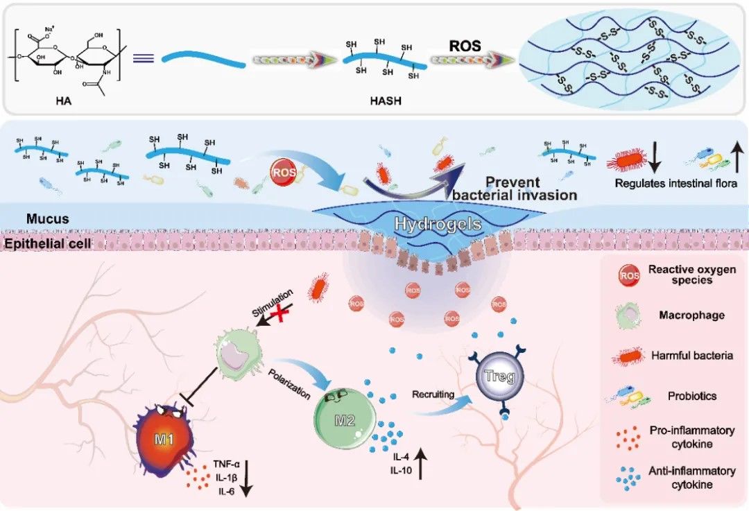 在该研究中,课题组设计了一种由硫醇修饰透明质酸(HASH)组成的ROS响应性水凝胶前体溶液。该溶液能够顺利通过上消化道,并在肠道炎症部位有效地响应ROS,形成水凝胶屏障,阻止微生物入侵并减少异常激活的免疫反应。小鼠饮用该溶液后,有效缓解了DSS诱发的体重减轻、结肠长度缩短和免疫细胞浸润等急性和慢性IBD症状。此外,该水凝胶前体溶液还通过调节细胞旁分泌和改变肠道菌群组成,缓解肠道炎症,促进肠道屏障功能恢复。该研究为可饮用水凝胶的合理设计提供了新见解,为人工黏液屏障的开发和IBD的口服治疗提供了一条新思路。