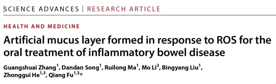 近日,Science子刊Science AdvancesIF=11.7)在线发表了pa电子官方网站何仲贵教授和付强教授课题组在ROS响应性人工黏液研究领域取得的最新研究成果,论文题目为“Artificial mucus layer formed in response to ROS for oral treatment of inflammatory bowel disease”。