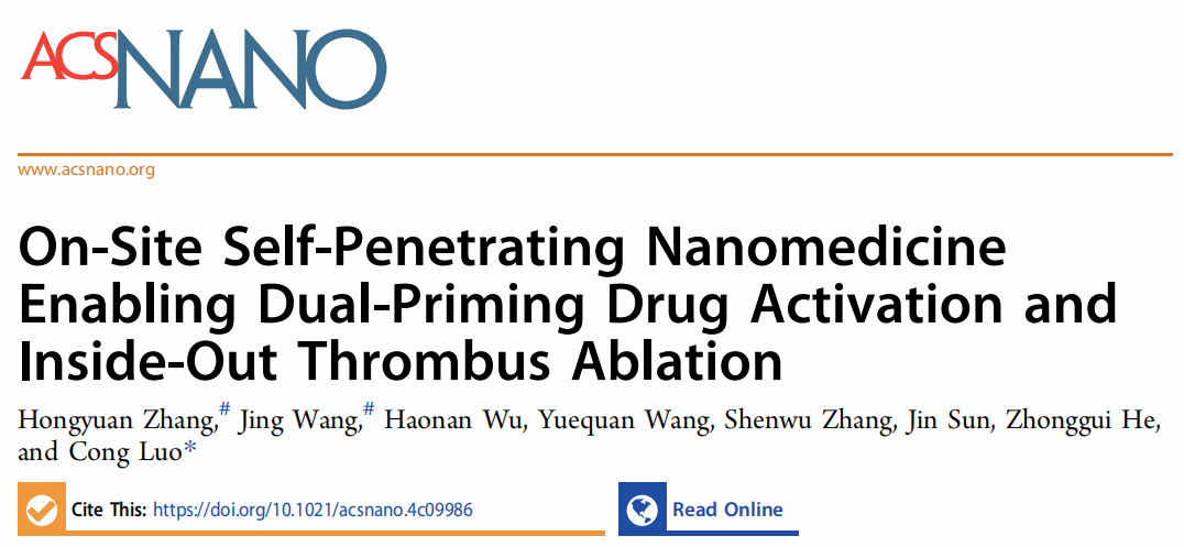 近日,pa电子官方网站罗聪教授团队在《ACS Nano》(IF=15.8)在线发表了最新研究成果“On-Site Self-Penetrating Nanomedicine Enabling Dual-Priming Drug Activation and Inside-Out Thrombus Ablation”。该研究提出了一种基于光热/光动双效光敏剂与氧化响应抗血小板前药共组装实现多模式激活抗血栓前药的新策略,有望解决血栓ROS异质性导致的前药激活瓶颈难题。在该研究中,作者首先设计合成了一种抗血小板药物替格瑞洛(TGL)的氧化响应前药(TGL-S-Fmoc, TSF)。随后,发现TSF可以与光热/光动双功能的光敏剂IR808共组装形成稳定的纳米结构。基于此,作者开发了一种自穿透、自激活、多模式协同的无载体纳米组装递药系统(T-TSFI NAs)。在光热效应的辅助下,T-TSFI NAs不仅能够实现血栓的深部穿透,还通过产生ROS协同内源性ROS触发前药按需激活,栓块内部释放抗血小板药物TGL,从而实现光热/抗血小板协同溶栓。T-TSFI NAs在FeCl₃诱导的大鼠颈动脉血栓模型中不仅有效抑制了血小板的激活和聚集,还显著降低了出血风险。这一策略成功克服了血栓微环境中ROS分布不均的难题,为抗血栓前药按需高效激活提供了新思路。