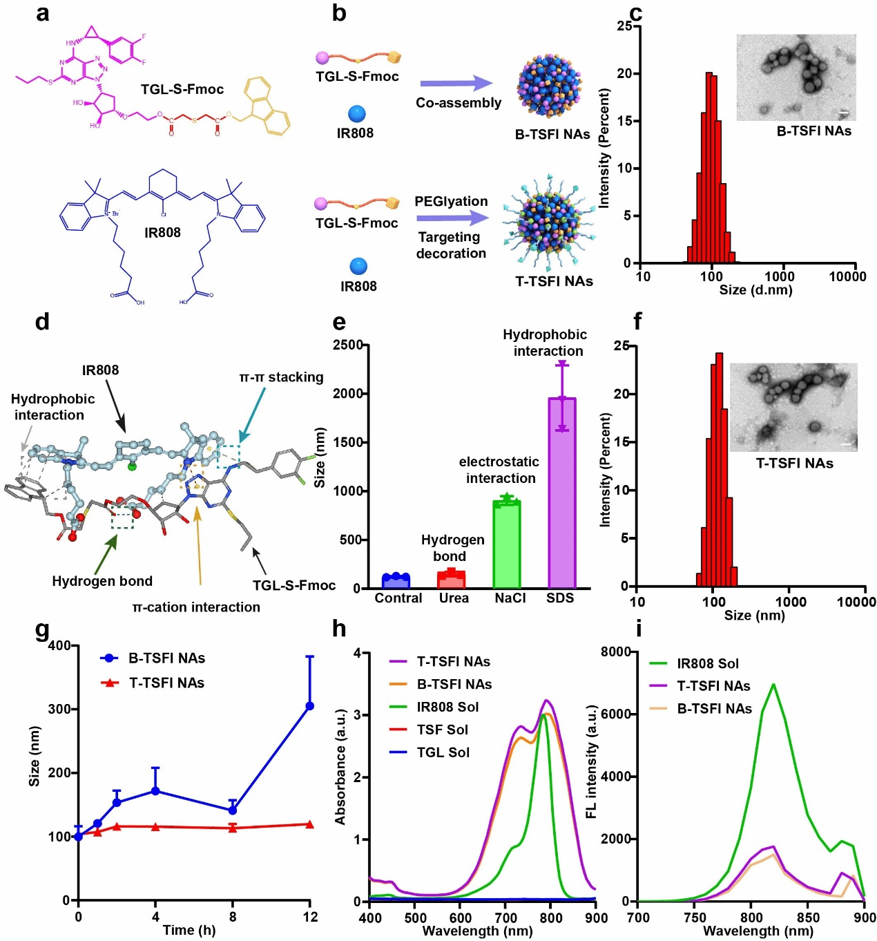 本文旨在利用氧化敏感键(单硫键)桥链抗血小板药物TGL和9-芴甲醇(9-Fluorenyl-methanol, Fmoc)形成前药(TGL-S-Fmoc, TSF),其中Fmoc作为修饰基团可增加TGL的疏水性增强药物组装性能。为了进一步实现纳米前药的深部渗透和高效激活,将兼具光热、光动双功能的光敏剂1-(5-羧基戊基)-2-(2-(3-(2-(1-(5-羧基戊基)-3,3-二甲基吲哚啉-2-亚基)亚乙基)-2-氯环己基-1-烯-1-基)乙烯基)-3,3-二甲基-3H-吲哚-1-鎓溴化物(IR808)与前药进行共组装,经少量的聚乙二醇(DSPE-PEG2K)和纤维蛋白靶向肽修饰的聚乙二醇(DSPE-PEG2K-CREKA)共同修饰后制成无载体前药纳米组装体(T-TSFI NAs),该纳米组装体展现出良好的制剂学性质,可以实现两种药物的高效共载和同步递送,具有良好的稳定性。(如图2所示)