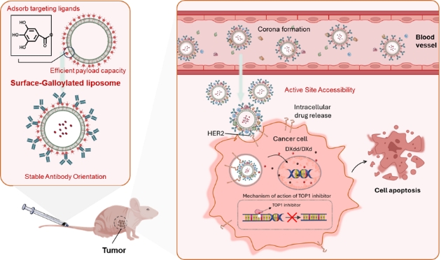 在肿瘤治疗和精准药物递送领域,靶向纳米载体因其高选择性和疗效潜力而备受期待。然而,蛋白冠效应会掩盖表面修饰的配体,导致靶向性丧失;同时,传统的抗体化学偶联工艺复杂,存在免疫原性风险和产业化障碍。这些瓶颈长期阻碍了主动靶向纳米药物的临床转化。近日,pa电子官方网站王永军教授团队在Nature Communications发表研究成果,报道了一种基于没食子酰基修饰脂质的表面没食子酰基化脂质体(Galloylated liposomes, GA-lipo)。该体系通过非共价方式稳定吸附抗体,实现抗体Fab端定向暴露,且不受蛋白冠遮蔽影响,在动物模型中验证了该策略的高效靶向递送和显著抗肿瘤疗效。