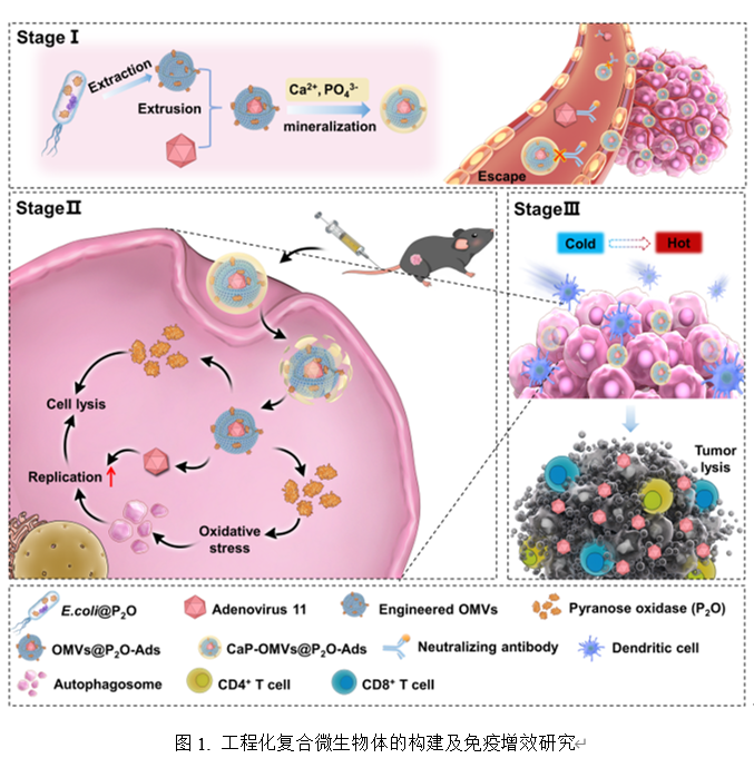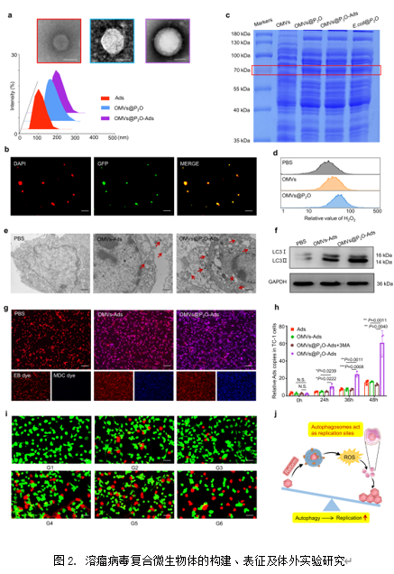 溶瘤病毒(OVs)疗法作为一种具备高效选择性和良好肿瘤杀伤能力的免疫疗法,近年来备受关注。然而,静脉递送效果差、瘤内复制效率不佳及免疫激活能力弱等关键问题制约着OVs临床应用。为此,pa电子孙进教授团队报道了基于工程化细菌外膜囊泡(OMVs)的OVs静脉递送系统来提高OVs免疫治疗效率。首先,作者通过基因工程手段获取含吡喃糖氧化酶(P2O)的OMVs。之后采用该囊泡为载体,通过挤压法在其内部荷载OVs,并利用仿生矿化技术在其表面修饰纳米级无定形磷酸钙。该系统屏蔽了表位抗原,能够延长在体循环时间,通过EPR效应促进OVs在肿瘤处的富集。利用P2O的催化作用能够有效提升肿瘤内氧化应激水平,促进癌细胞过度自噬,并以自噬小体为复制场所,增加OVs复制效率。此外,OMVs作为免疫激活剂,可重塑肿瘤免疫抑制微环境,进而增强OVs介导的抗肿瘤免疫响应。本项目将为OVs介导的抗肿瘤免疫增效提供重要的理论基础和可行的解决策略。相关成果发表在《Nature Communications》期刊,论文题目为:Engineered bacterial outer membrane vesicles encapsulating oncolytic adenoviruses enhance the efficacy of cancer virotherapy by augmenting tumor cell autophagy。